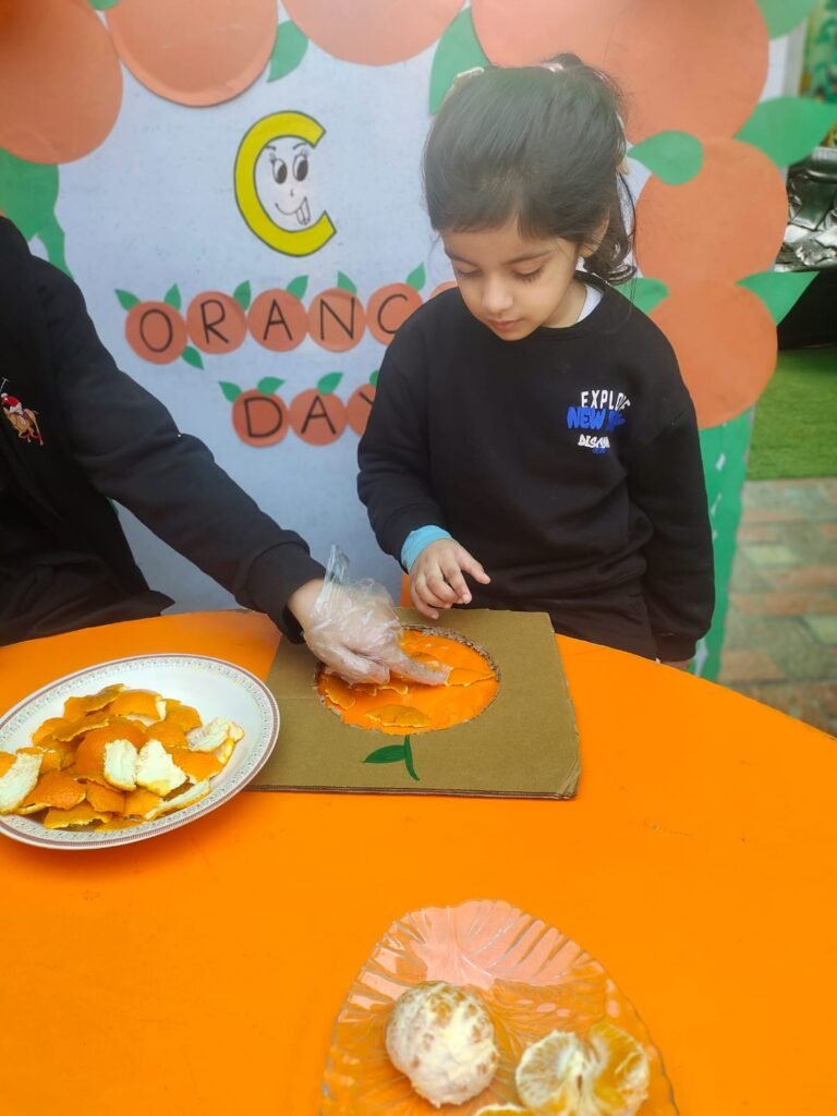 A range of engaging classroom activities formed the heart of the celebration. Art and craft sessions allowed children to explore their creativity using orange paint, crayons, paper, and textured materials. The children created drawings of oranges, carrots, pumpkins, and suns, while handprint art became a favorite activity. These creative tasks strengthened fine motor skills, improved hand-eye coordination, and encouraged self-expression in a fun and relaxed setting.