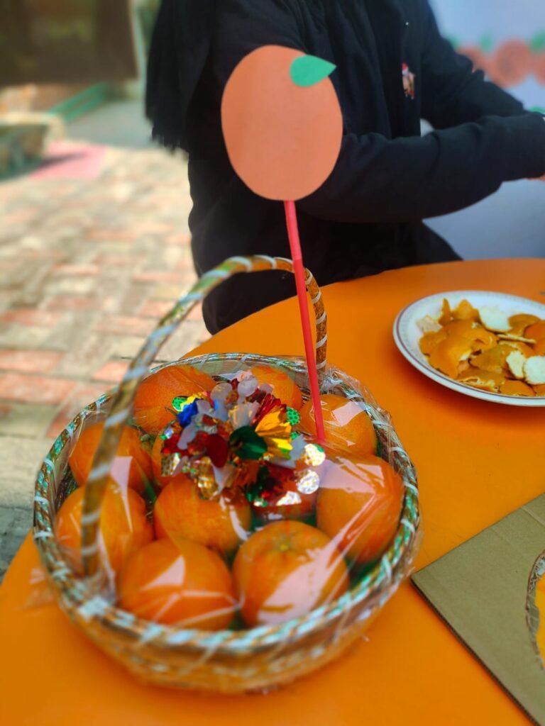 Snack time was both exciting and educational. Healthy orange-colored snacks such as oranges, carrots, mango juice, and other nutritious treats were shared among the children. Teachers used this opportunity to introduce the importance of healthy eating habits and the benefits of fruits and vegetables. Children learned that food can be both healthy and enjoyable, reinforcing positive lifestyle choices from an early age.